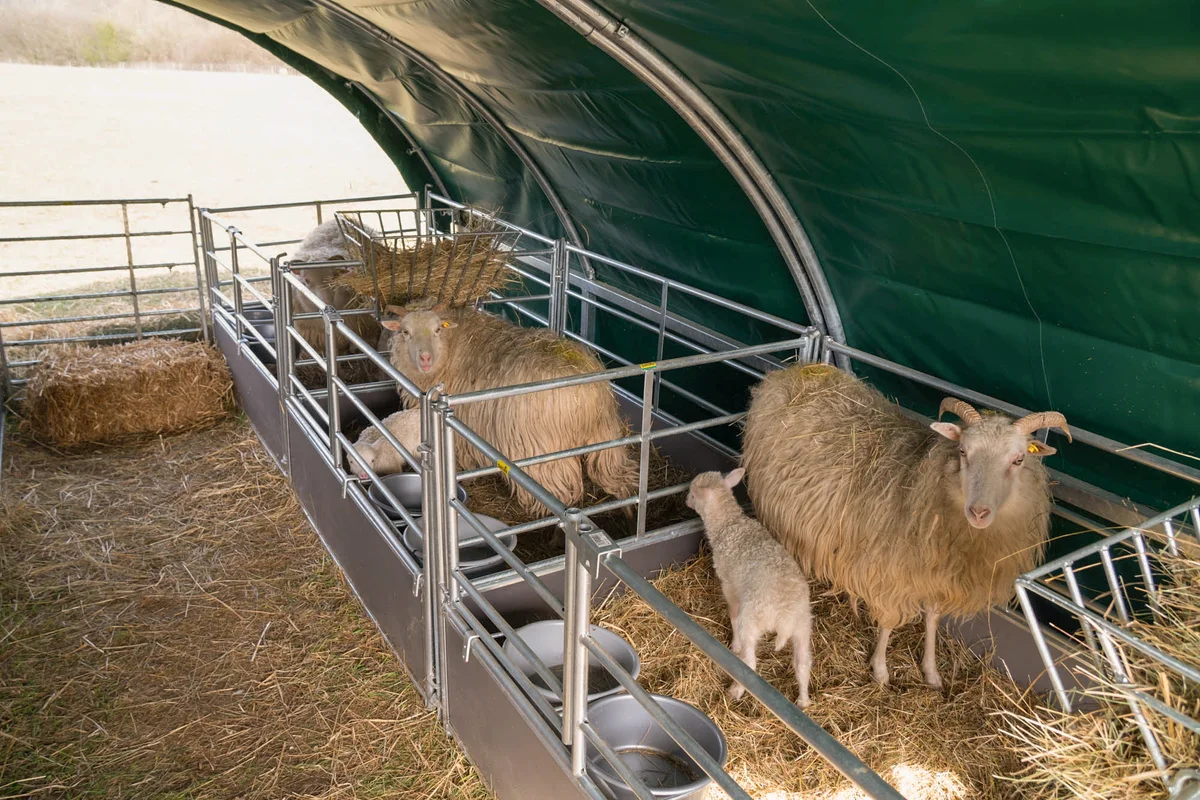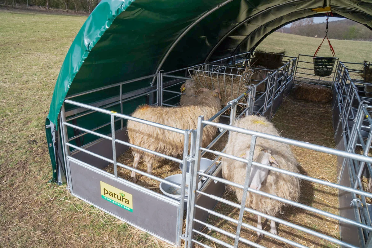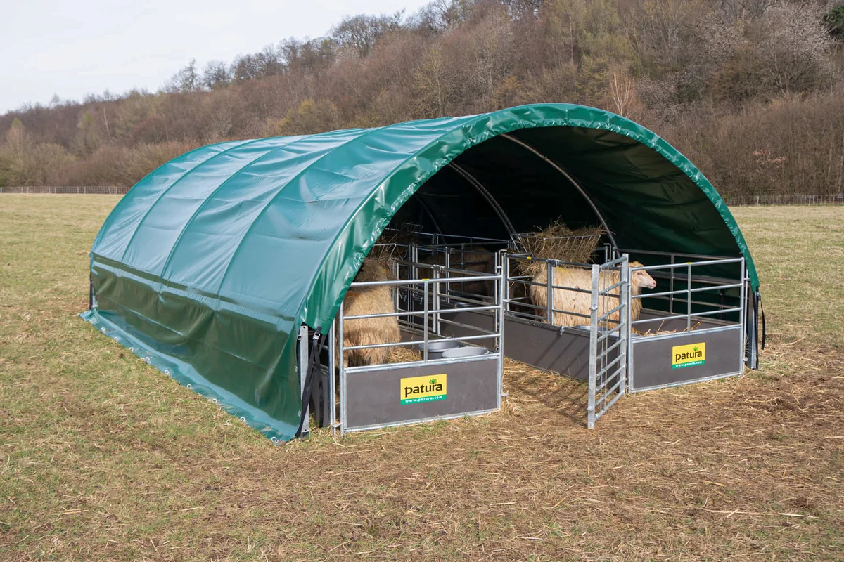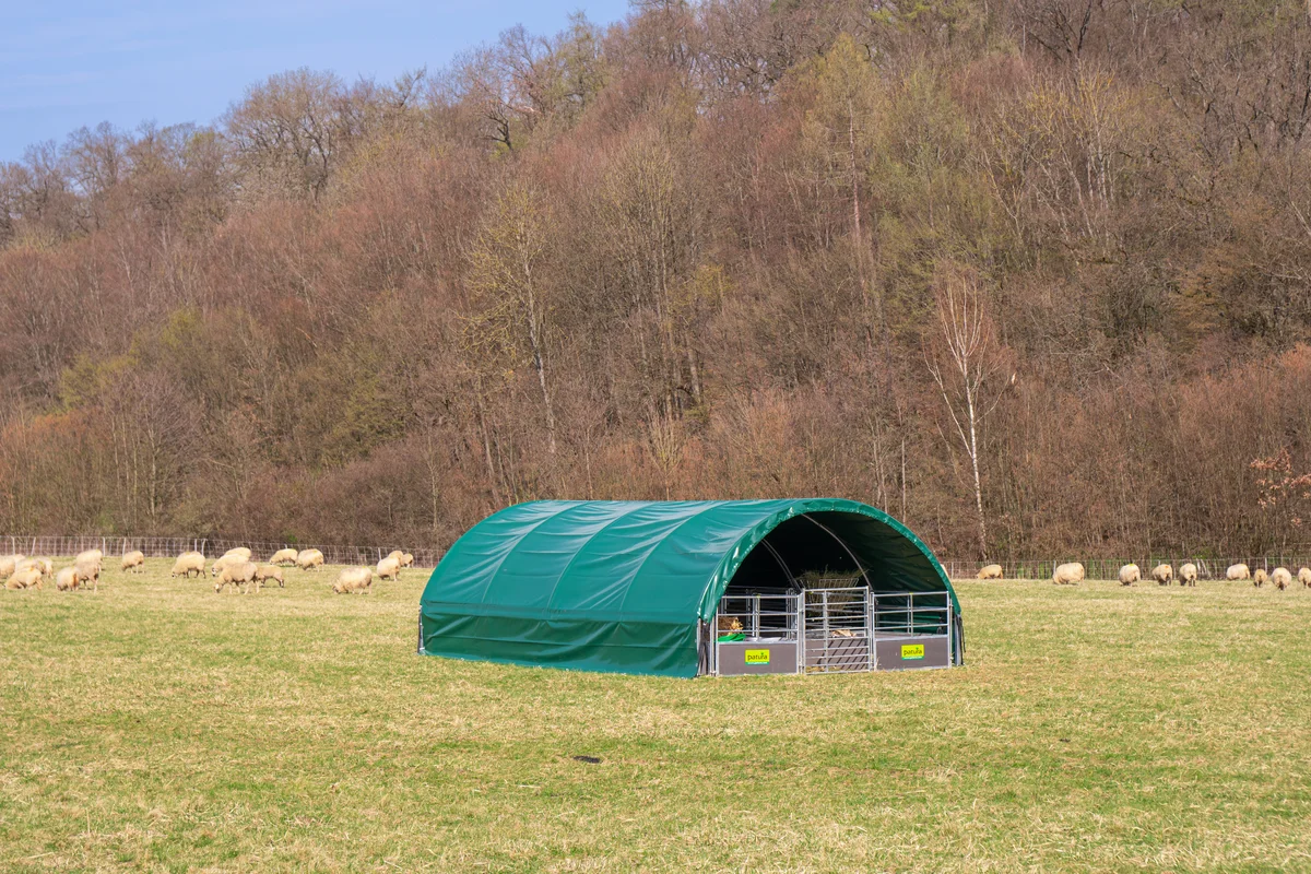 Mobiele schuilstal van 6.00 x 3.60 mtr voor schapen en geiten. Zeer robuuste schuilstal in tunnelvorm en in minder dan een uur opgebouwd. Deze schuilstal heeft een dakconstructie met 5 gebogen staanders. Compleet geleverd zoals op de foto. Alle bevestigingsmaterialen inbegrepen.