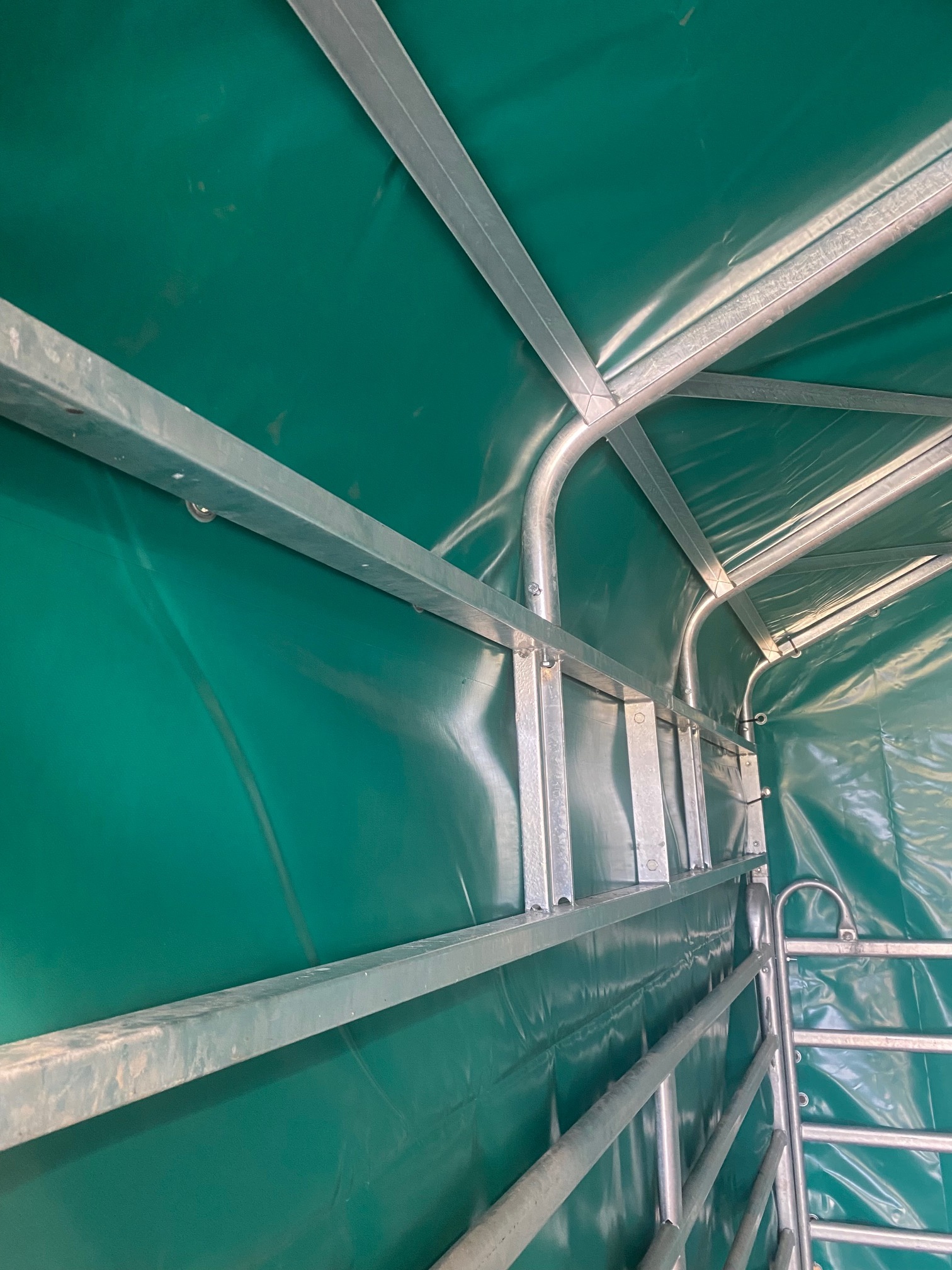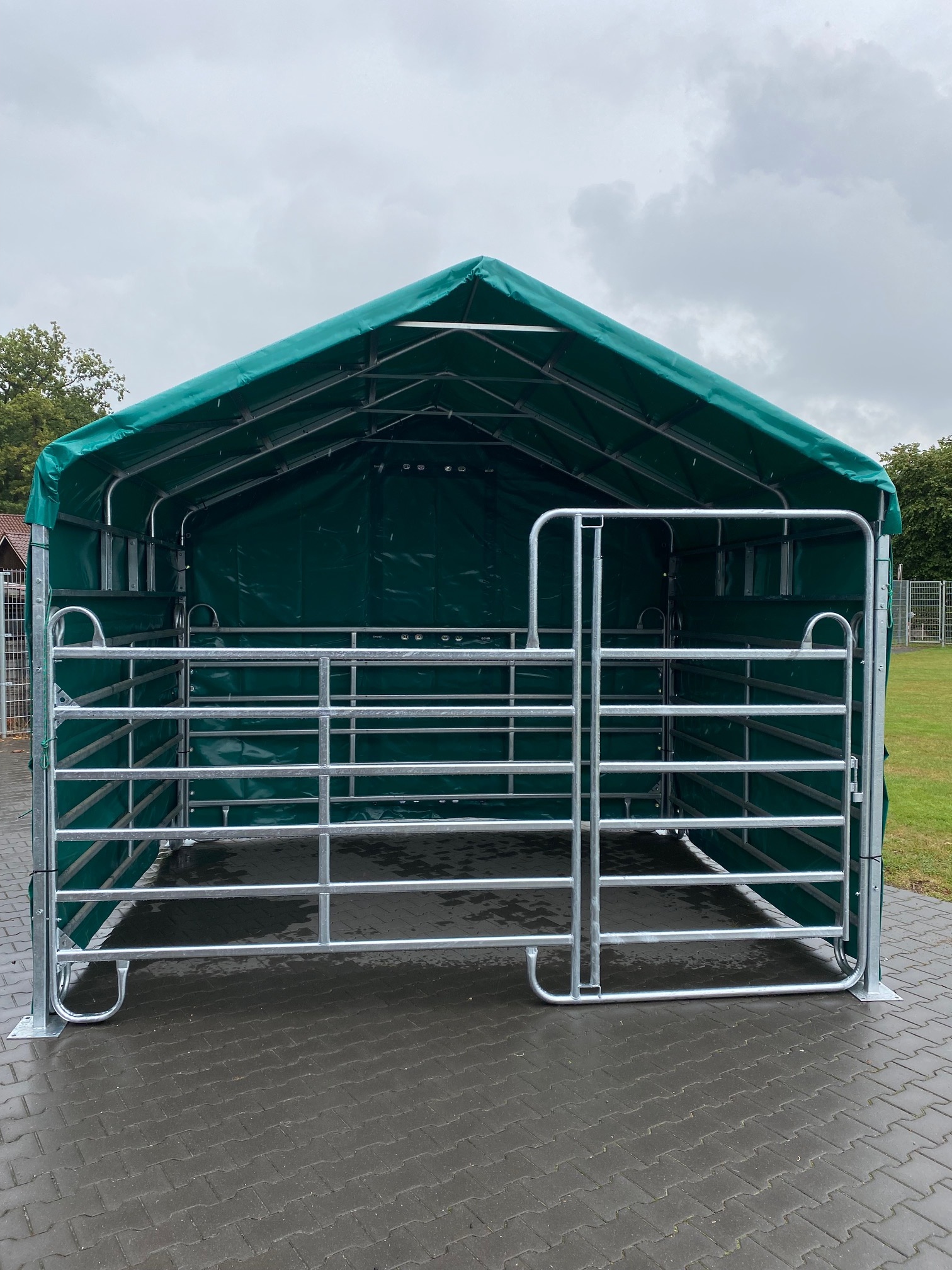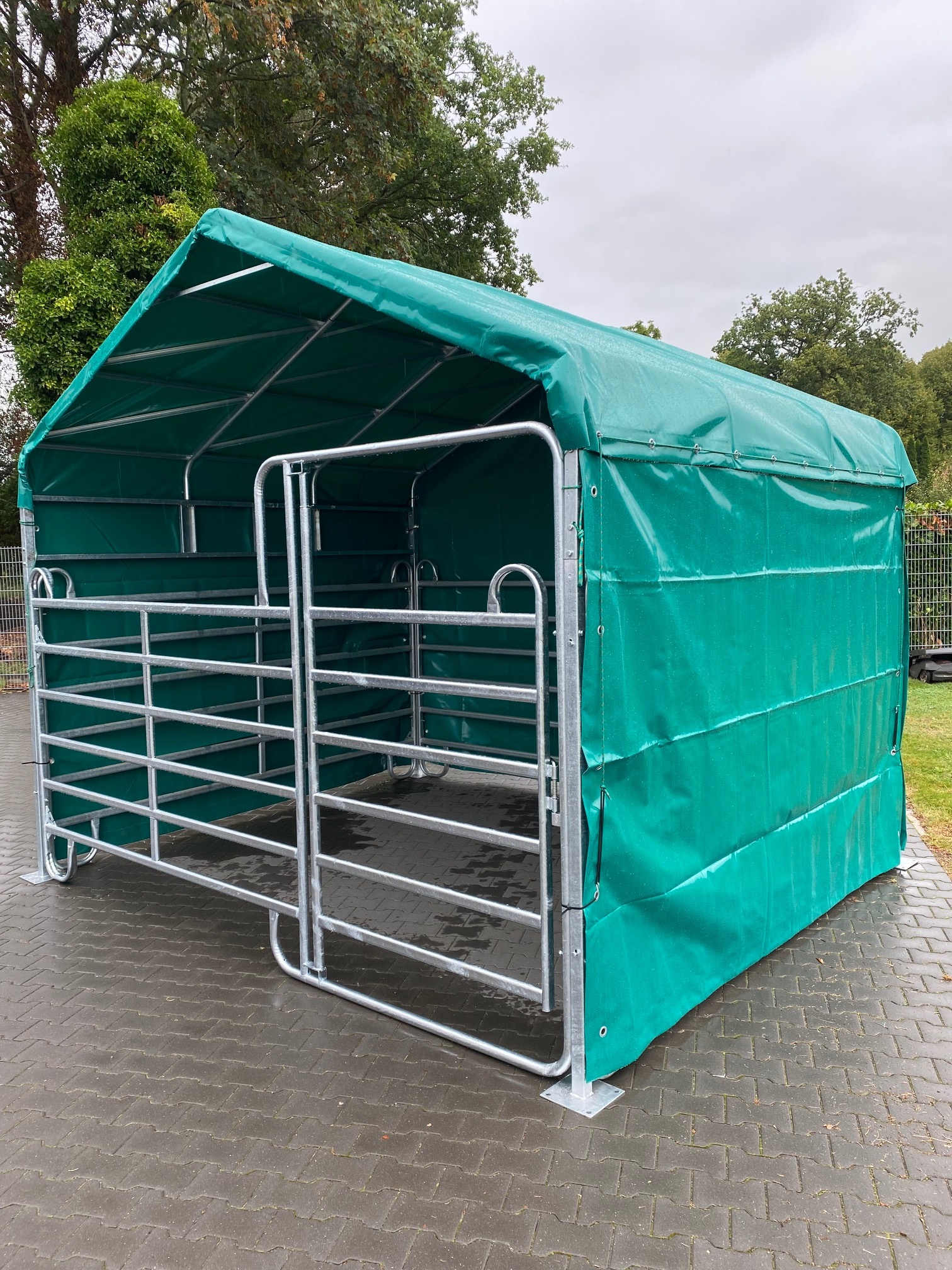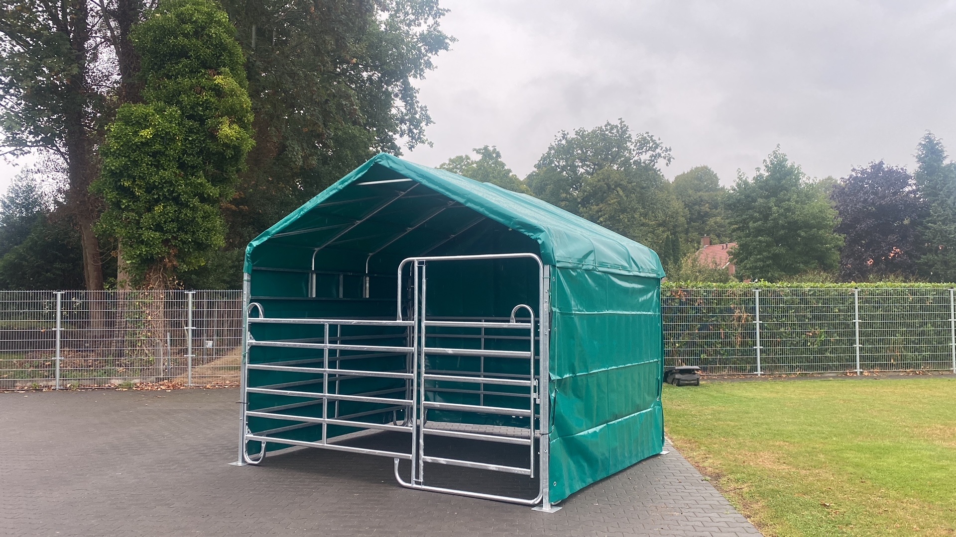 Deze zwaar uitgevoerde mobiele schuilstal heeft een zelfdragende dakconstructie. Dit houdt in dat de het dak niet direct op de hekken rust zoals bij veel andere stallen. Het dak rust op maar liefst 4 robuuste ondersteuningsvoeten. De hekken grijs XL (3.60 en 3.00 mtr) zitten tussen de constructie in. De poten zijn uitgevoerd met gaten voor verankering, lange grondpennen inbegrepen. Daarnaast zitten bij deze stal standaard zeilen t.b.v. de achterzijde en de twee zijkanten. Alle bevestigingsmaterialen inbegrepen. Een hek met een poort aan de voorzijde is optioneel.