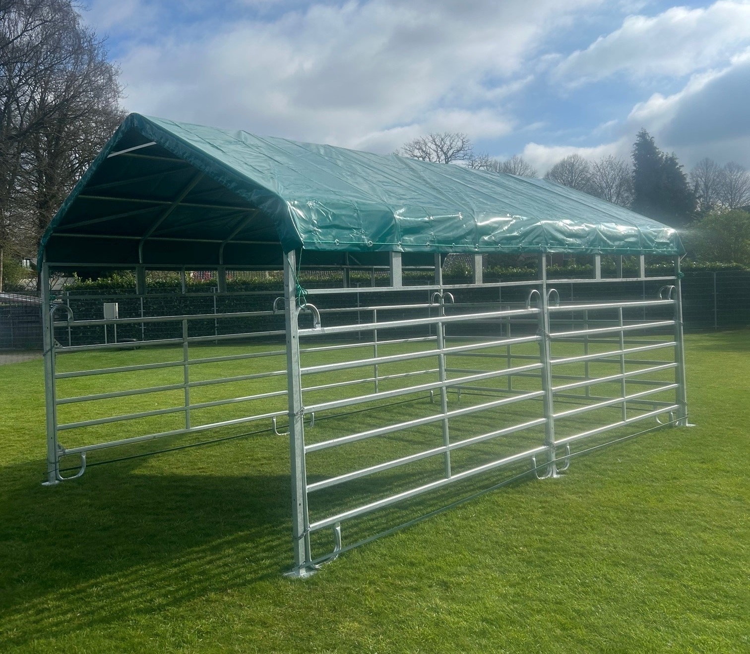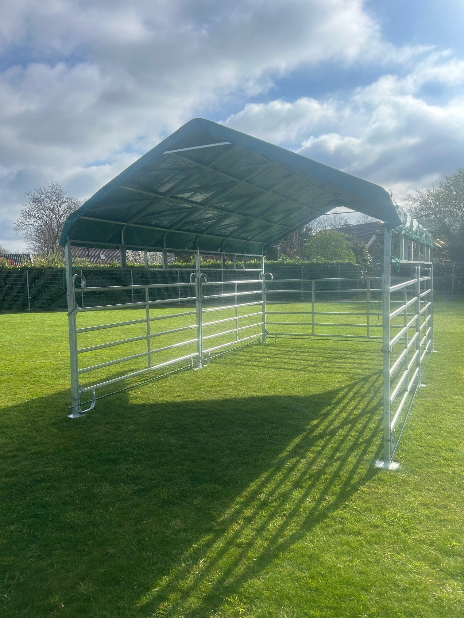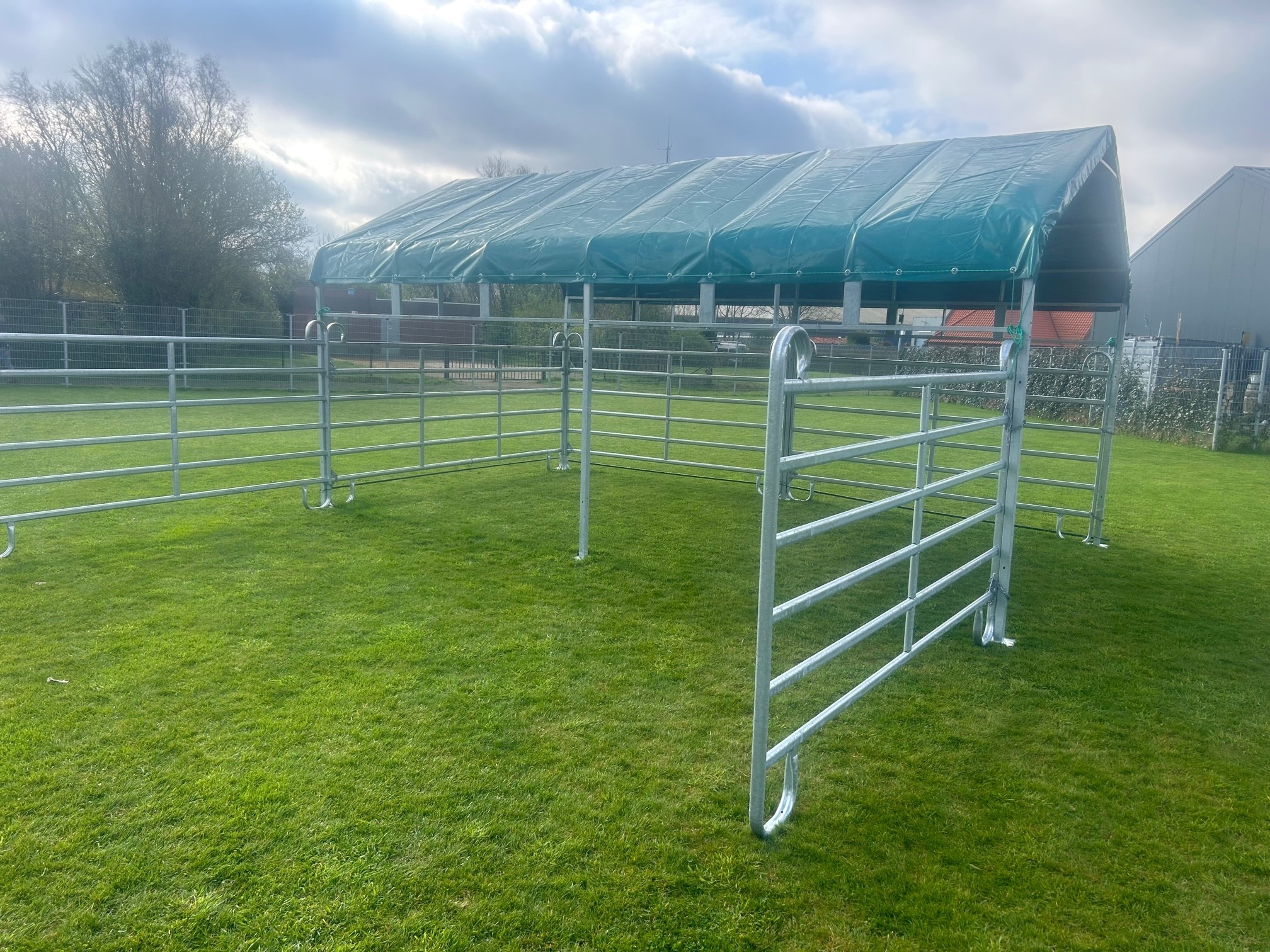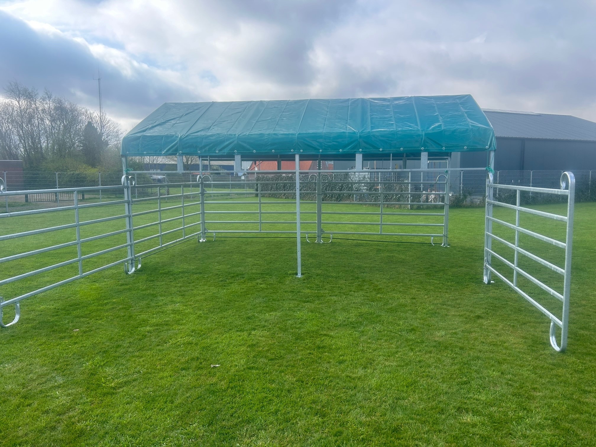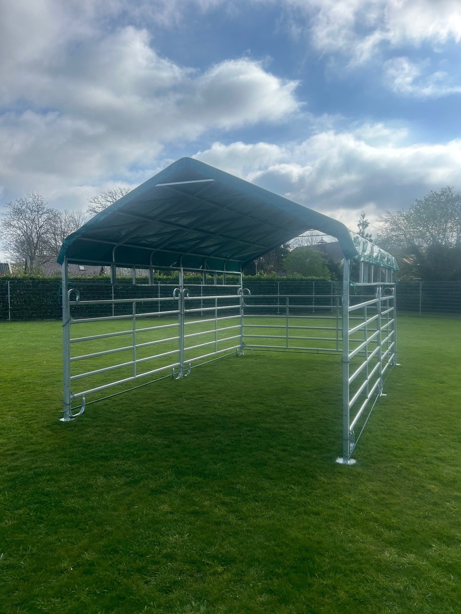 Zwaar uitgevoerde mobiele schuilstal met een zelfdragende dakconstructie. Dit houdt in dat de het dak niet direct op de hekken rust zoals bij veel andere stallen wel het geval is. Het dak rust op maar liefst 6 robuuste ondersteuningsvoeten. De hekken grijs XL (3.60 en 6.00 mtr) zitten tussen de constructie in. De poten zijn uitgevoerd met gaten voor verankering, grondpennen zijn inbegrepen. Daarnaast zitten bij deze stal standaard zeilen t.b.v. de achterzijde en de twee zijkanten. Alle bevestigingsmaterialen inbegrepen. Een hek met een poort aan de voorzijde is optioneel.